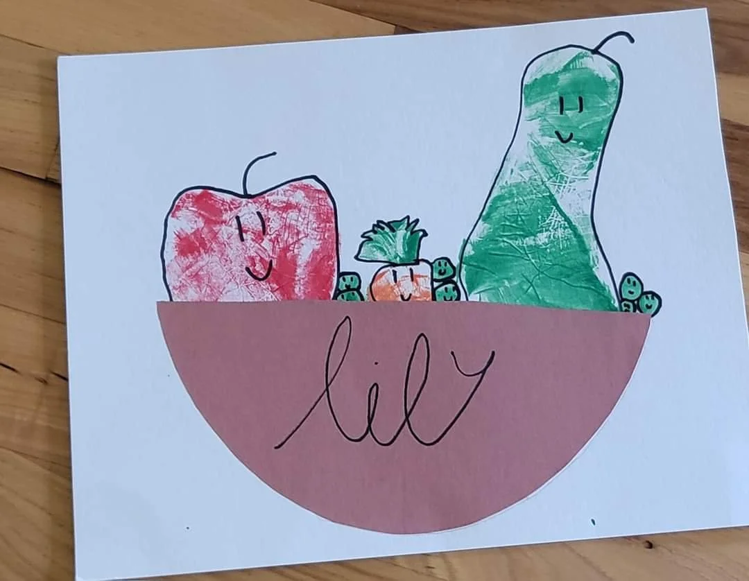 Lily - bowl of fruits/veggies made with her footprint, palm, and fingertips.